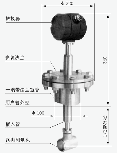 將渦街測量頭插入管道特定位置,通過測量該位置的局部流量,根據(jù)管道截面流速分布關(guān)系,計算出管道內(nèi)平均流速值。它由轉(zhuǎn)換器、插入桿組件、球閥( 根據(jù)需求配 )、安裝短管(ф100)、渦街測量頭等組成。