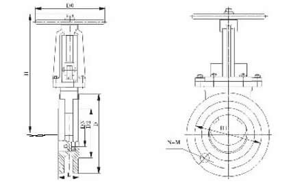 手動刀型閘閥的構(gòu)造圖及主要外形及連接尺寸(mm):